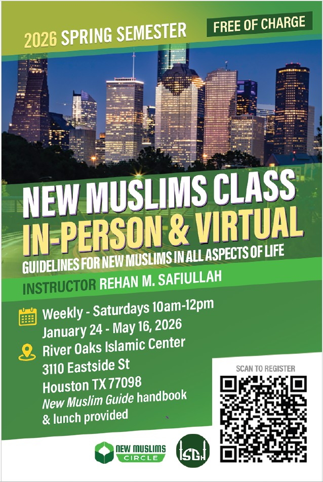 The New Muslims Class will be starting Saturday, January 24th, 2026, Insha Allah. The class will cover guidelines for new Muslims in all aspects of life.